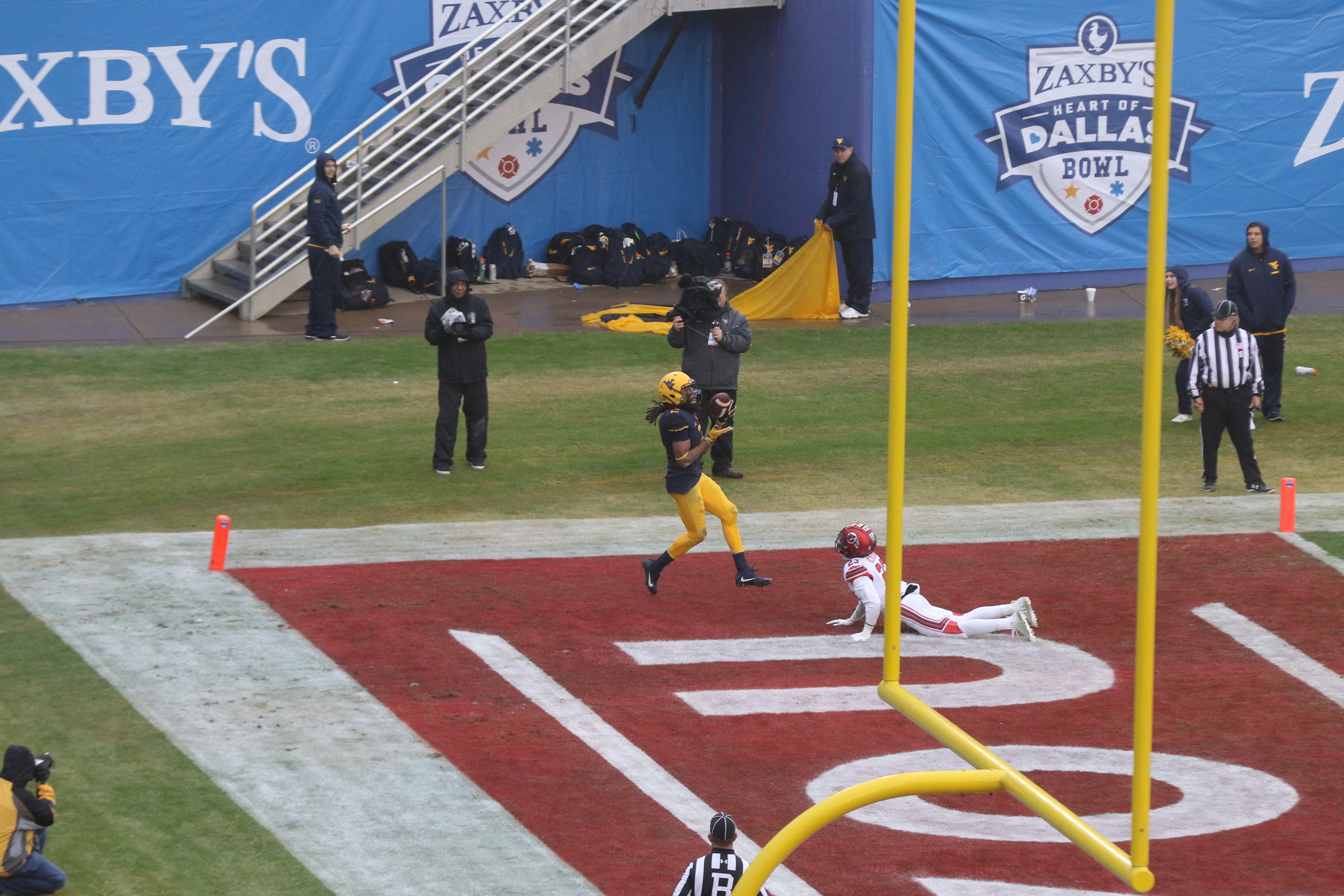West Virginia WR Ka’Raun White (No. 2 pictured and younger brother of Chicago Bears WR Kevin White) became the second member of the White family to eclipse the 1,000-yard barrier with this touchdown catch in the fourth quarter.