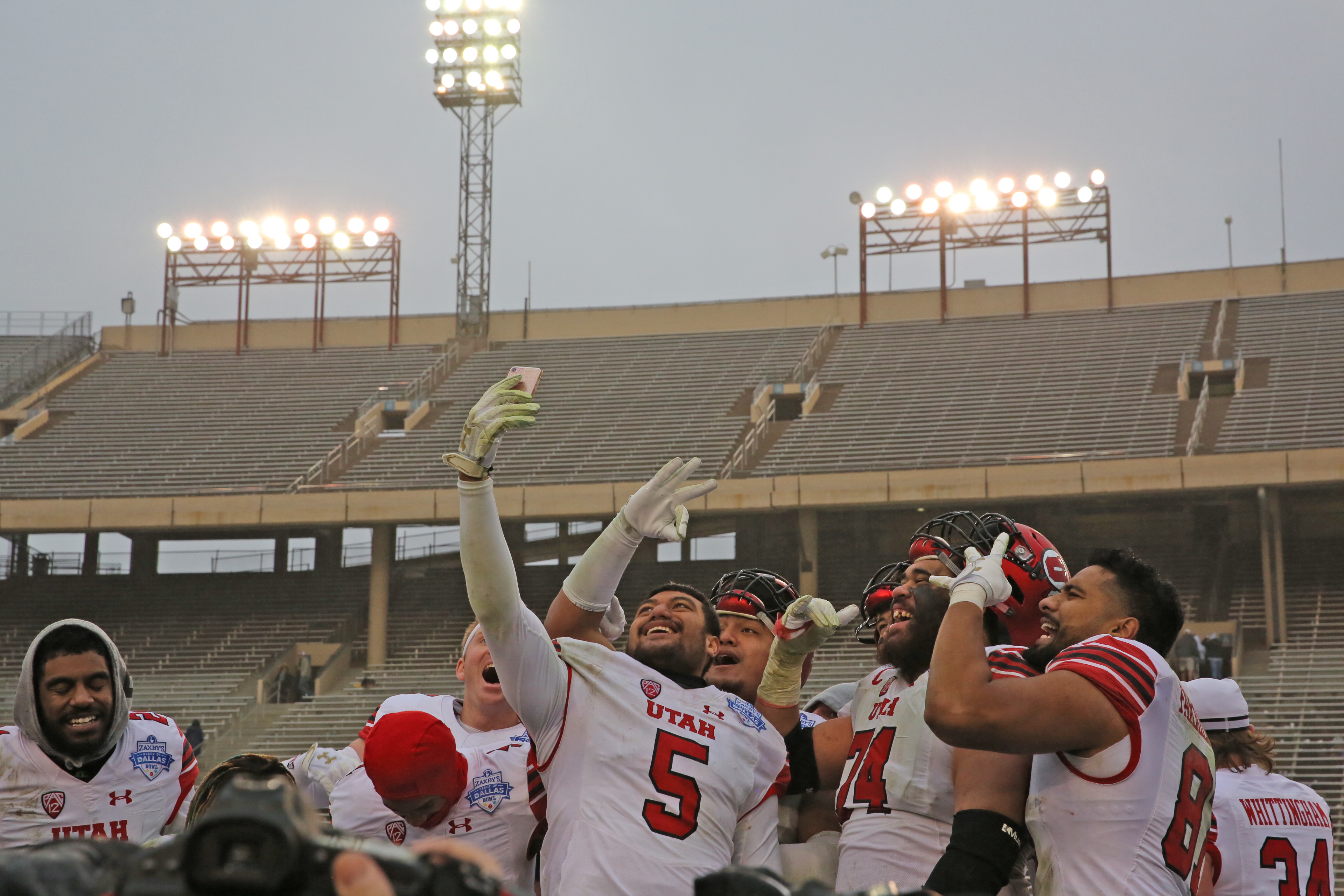 Utah LB Kavika Luafatasaga leads his team with an Instagram selfie while celebrating the Utes 30-14 victory over the Mountaineers.